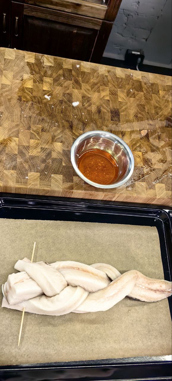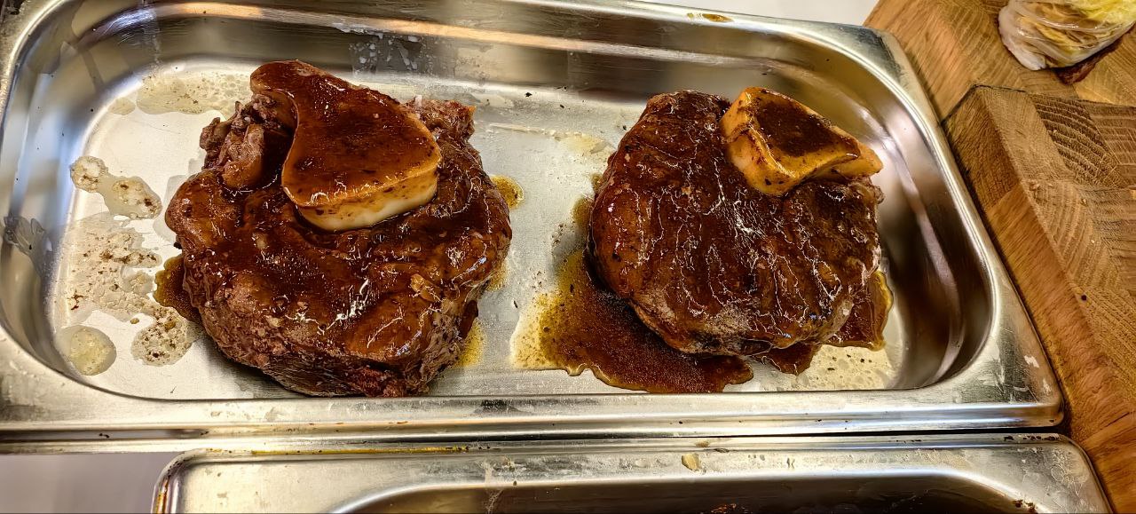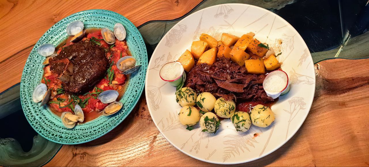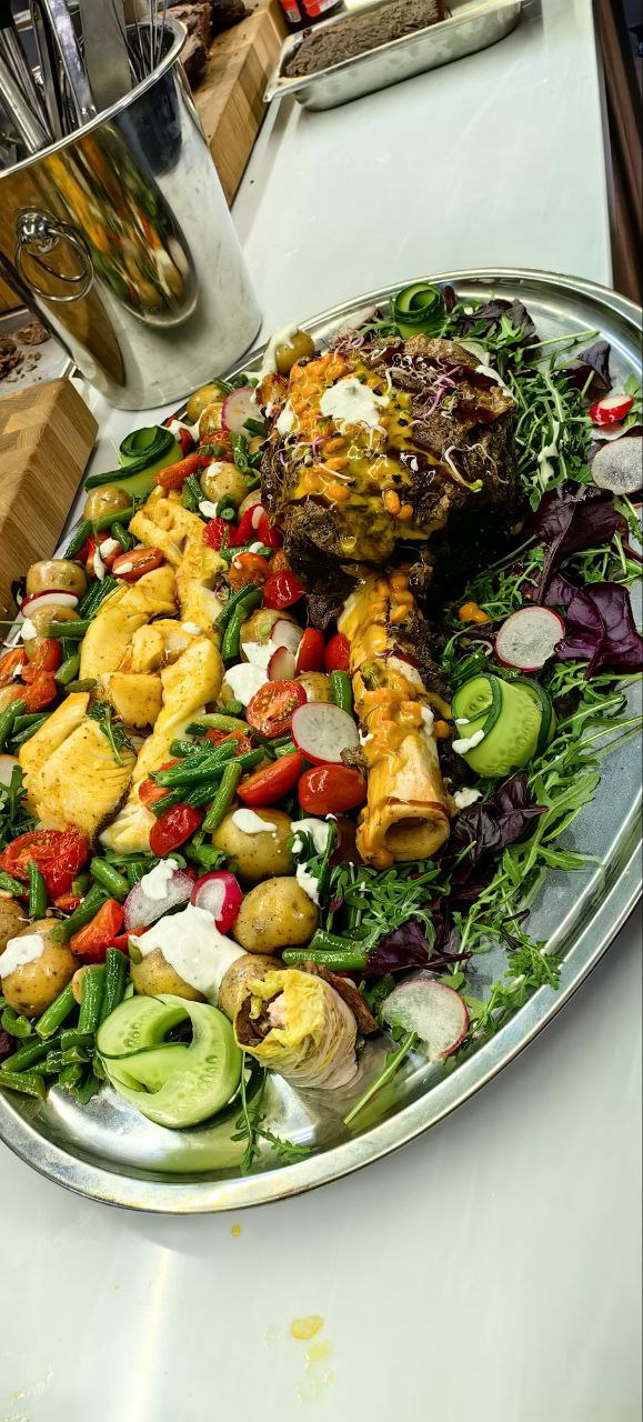 - Банкетное блюдо: запеченная голяшка лося с рыбной косичкой. Подавалась с тремя соусами: облепиховым, горчично-сметанным и демигласом из дичи. На гарнир — зеленый салат и запеченный картофель с фасолью.