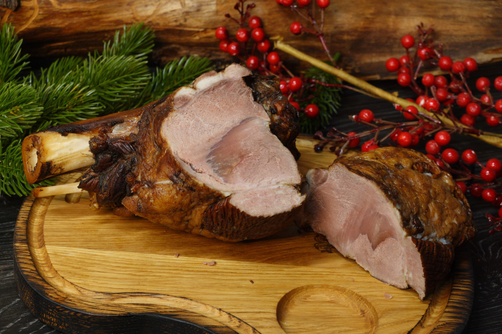 Рулька кабана варено-копченая – любимая многими закуска, которая выручит, если на пороге стоят гости. Ее можно подавать как основное блюдо. В качестве гарнира подходят любые овощи. Варено-копченую рульку кабана можно использовать для запекания или приготовить на ней вкусный, наваристый суп, который поразит ароматом дичи. Это натуральный продукт, в приготовлении которого не использовалось никаких консервантов. Для придания аромата и вкуса в качестве дополнения к рульке идут соль, чабрец, розмарин и перец.