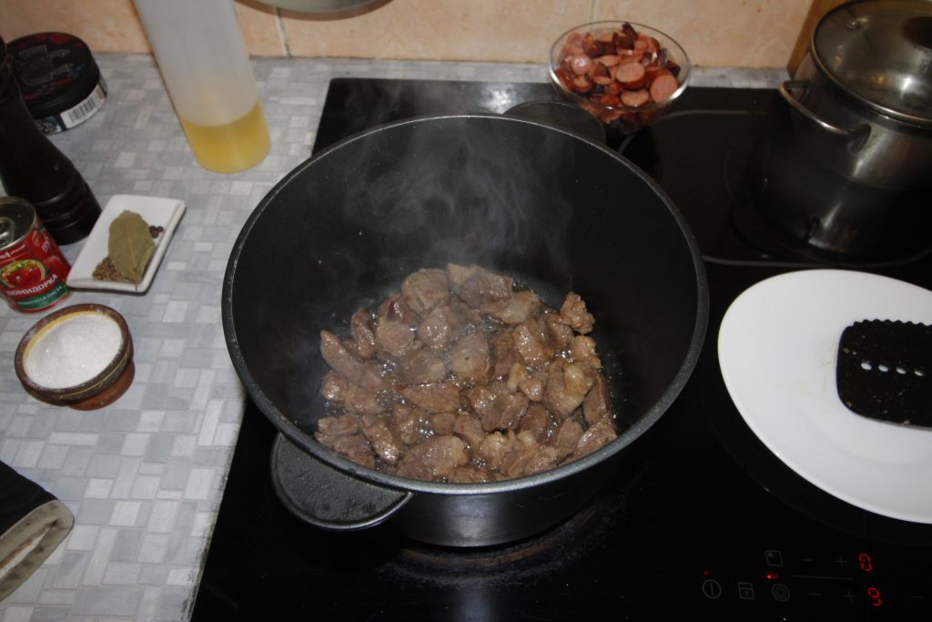 Разогрейте в казане масло. Пожарьте до золотистого цвета грудинку, добавьте сосиски. Готовьте все вместе 2-3 минуты. Достаньте копчёности шумовкой.