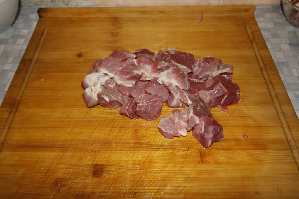 Уберите с мяса плёнки, порежьте кусочками 1,5 сантиметра.
