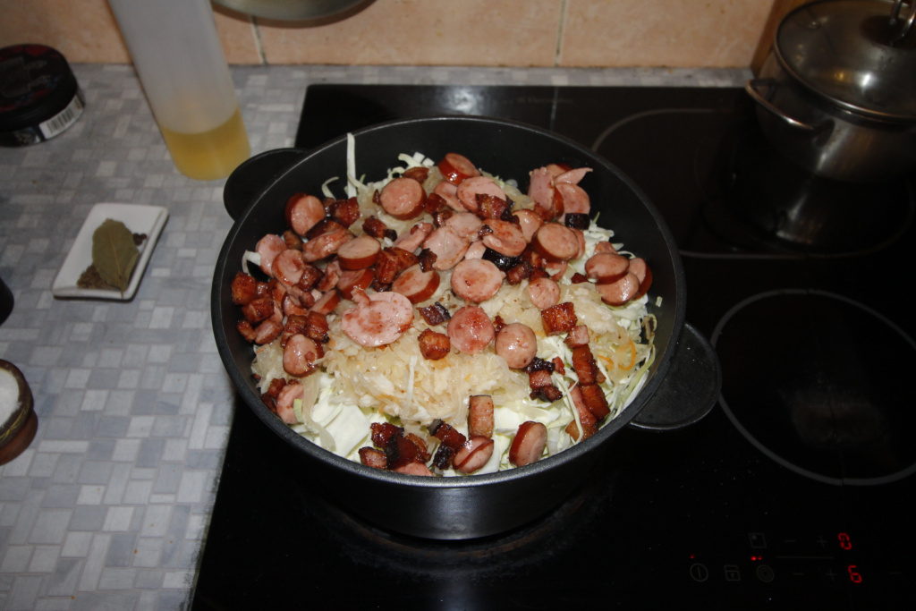 Разбавьте загустевший соус половиной стакана кипятка, отправьте в казан свежую капусту, потом квашенную и копчёности. Тушите 10 минут под крышкой. Перемешайте, накройте, оставьте на 50 минут при умеренной температуре.
