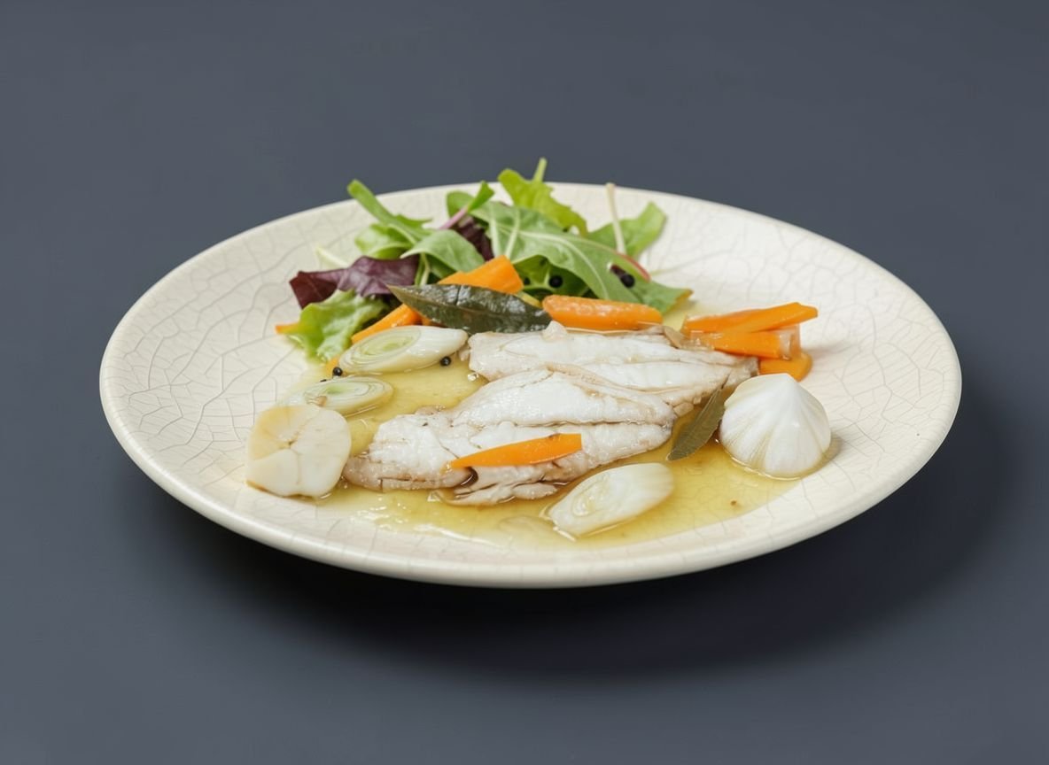 Для подачи на блюдо выложить овощи (лук-порей и морковь). Рядом определить кусок дорадо. Сверху залить маринадом. Декорировать листьями салата или другой зелени и обжаренной головкой чеснока.