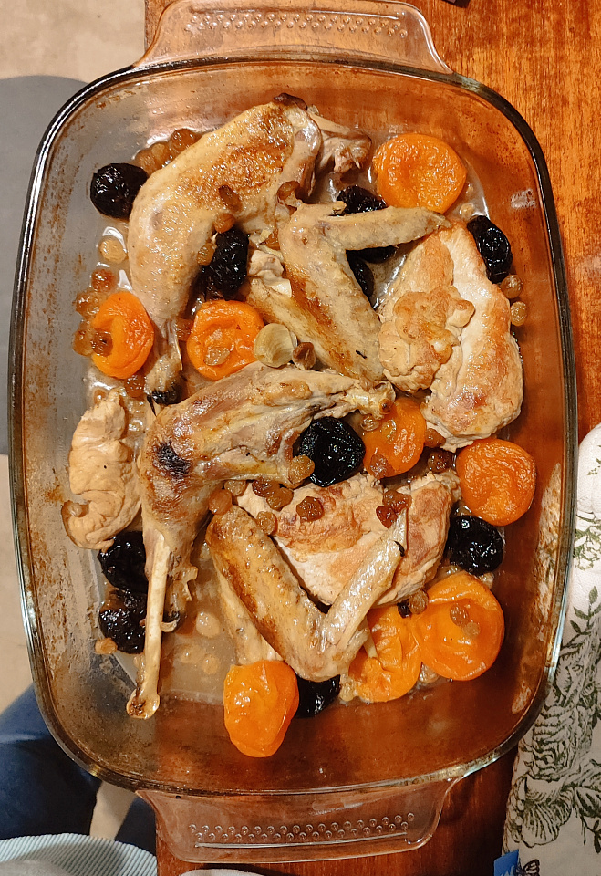Фазан тушеный с сухофруктами в белом вине