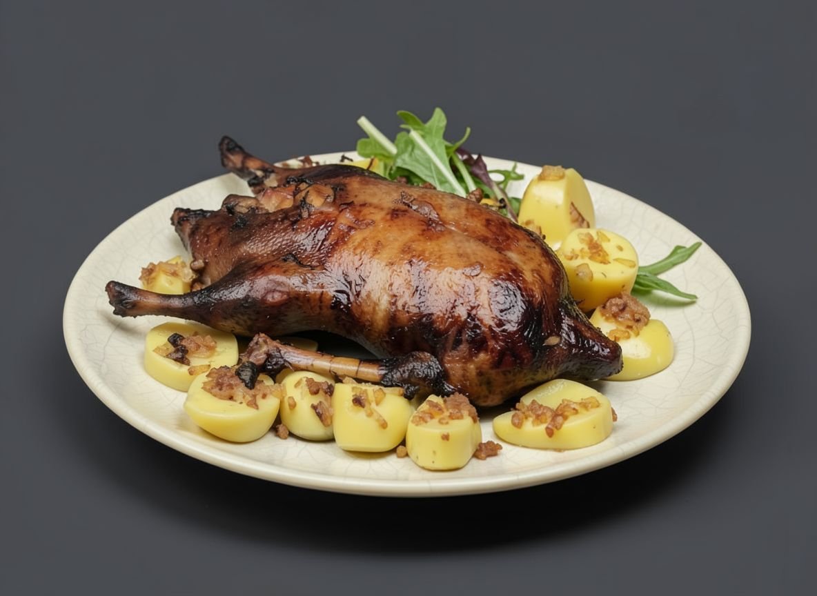 Подавайте готовую птицу на большом блюде с отварным картофелем и соленьями. Приятного аппетита!