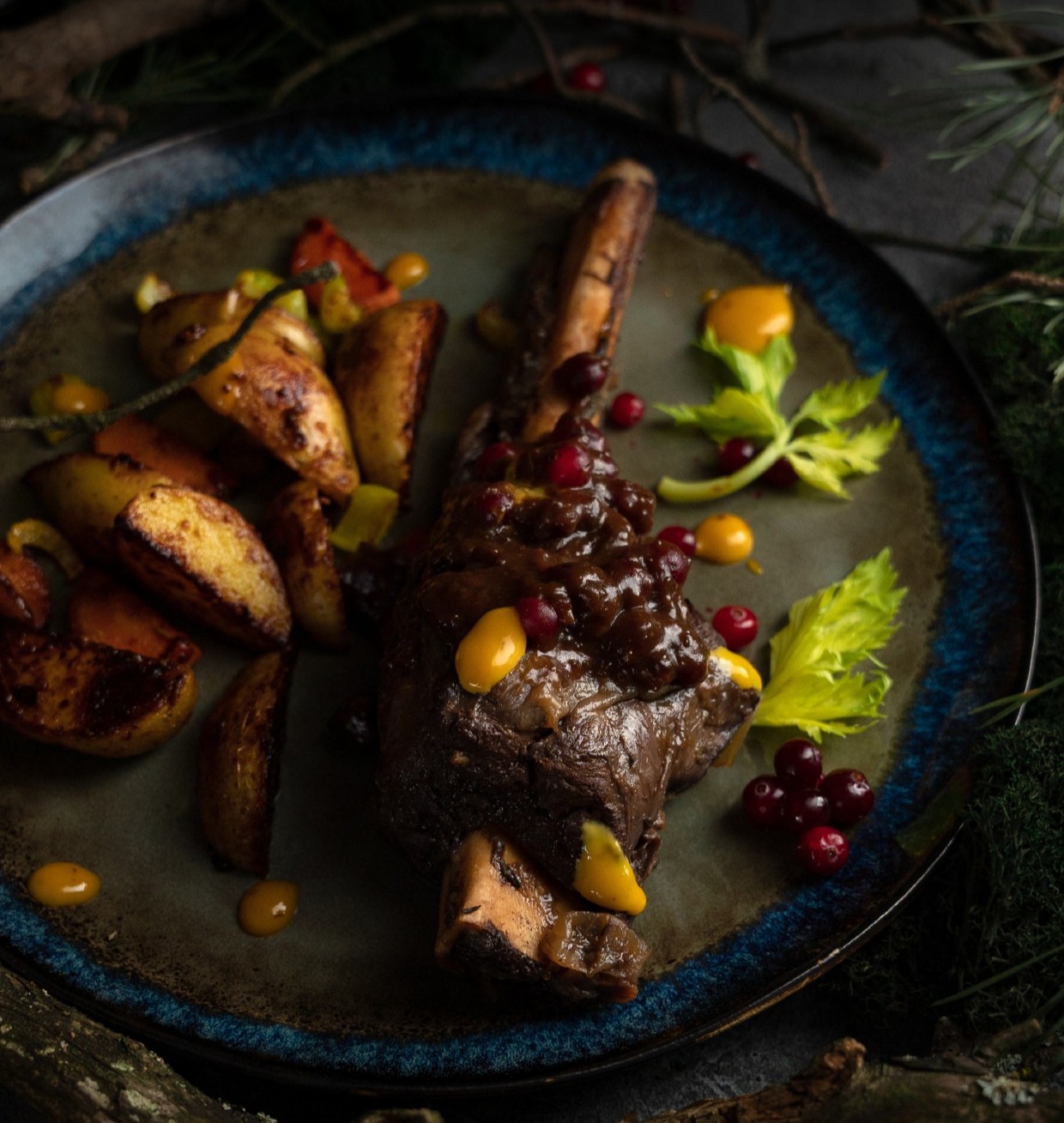 Подают блюдо на подогретой тарелке, выкладывая гарнир из запечённых корнеплодов, рядом размещают голяшку на кости и поливают ягодным соусом, украшая тимьяном или розмарином и свежими ягодами.