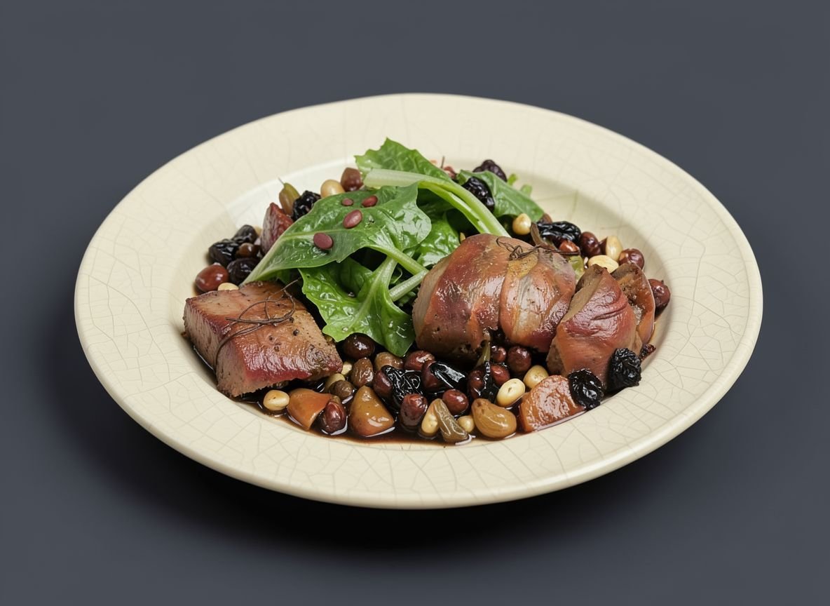 Разделите мясо на порции и подавайте с орехами и фруктами. Для гарнира подойдёт рис, например, смесь белого и дикого.