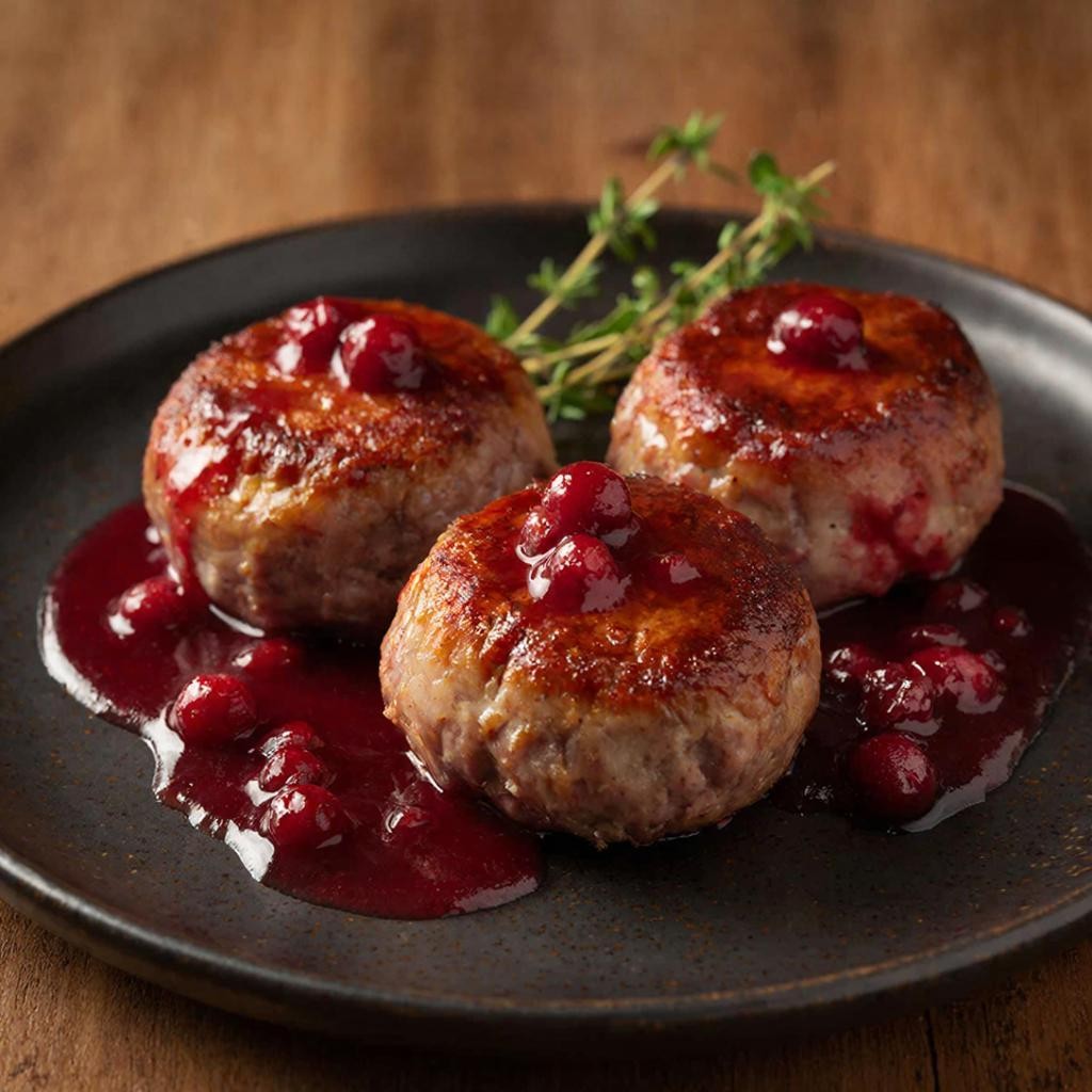 Верните биточки в сковороду и прогрейте их в соусе ещё 3–5 минут, чтобы мясо вобрало аромат ягод и вина.