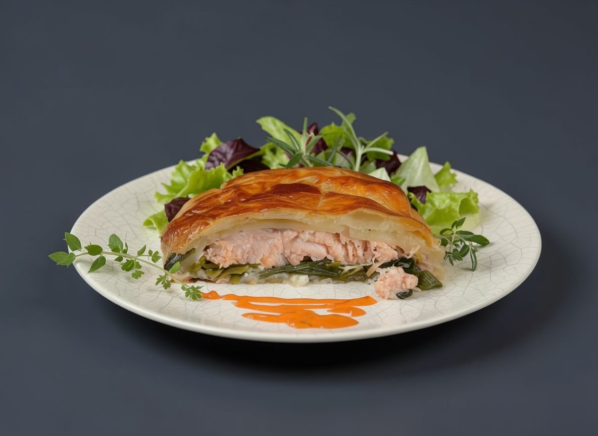 Вынуть кижуча в тесте из духовки, перед подачей на стол дать пирогу постоять минут пять. Затем нарезать кусками и разложить по тарелкам. Украсить микрозеленью.