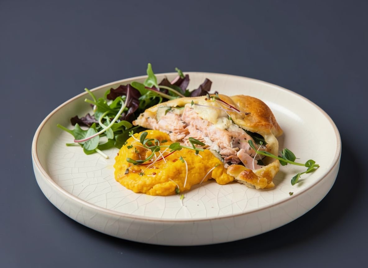 Красная рыба (горбуша) в тесте со шпинатом и хумусом из тыквы