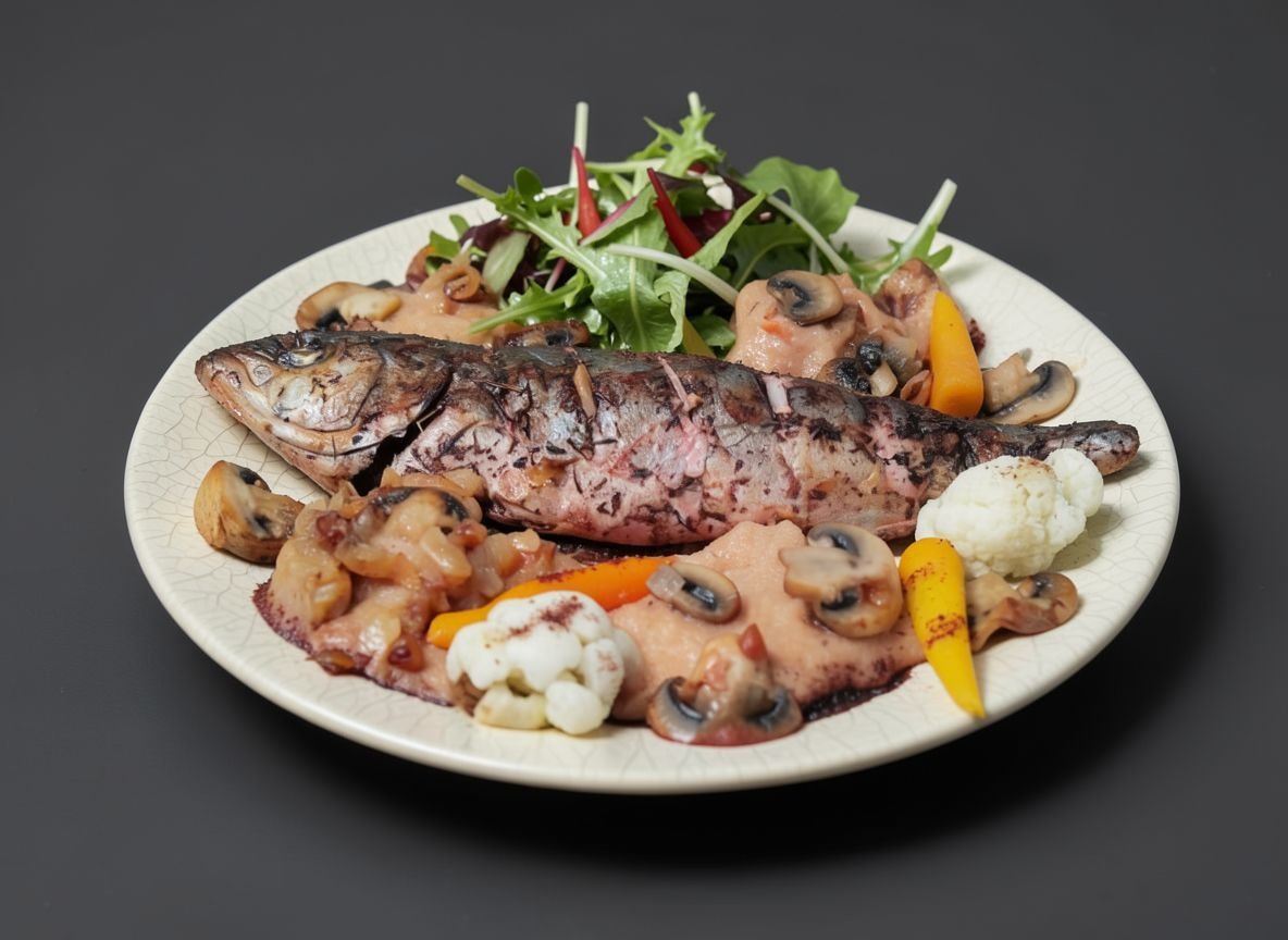 Лакедра с сумахом и овощным пюре с шампиньонами