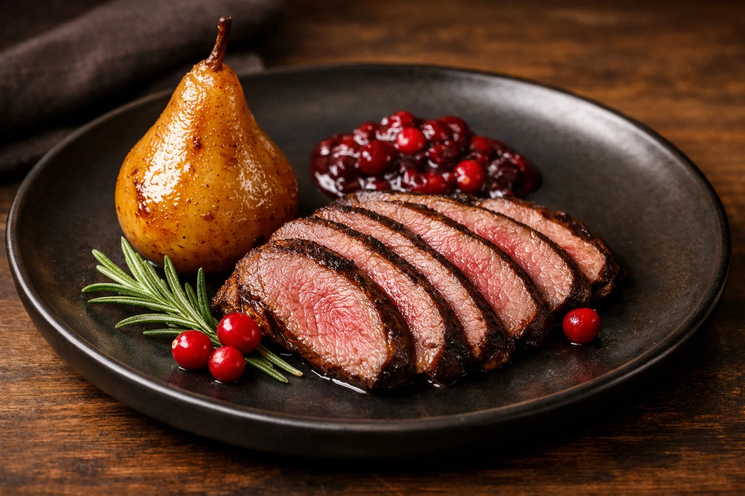 Лопатка косули — благородная часть дикой косули с нежным мясом и богатым вкусом, который особенно хорошо раскрывается в сочетании с кисло-сладкими акцентами. В этом рецепте косуля маринуется в красном вине с ягодами и травами, запекается до сочной степени прожарки medium, а затем подаётся с глазированной грушей и ароматным клюквенным соусом. Сочетание сладости груши и яркой кислинки клюквы делает это блюдо идеальным для праздничного обеда или эффектной ресторанной подачи.