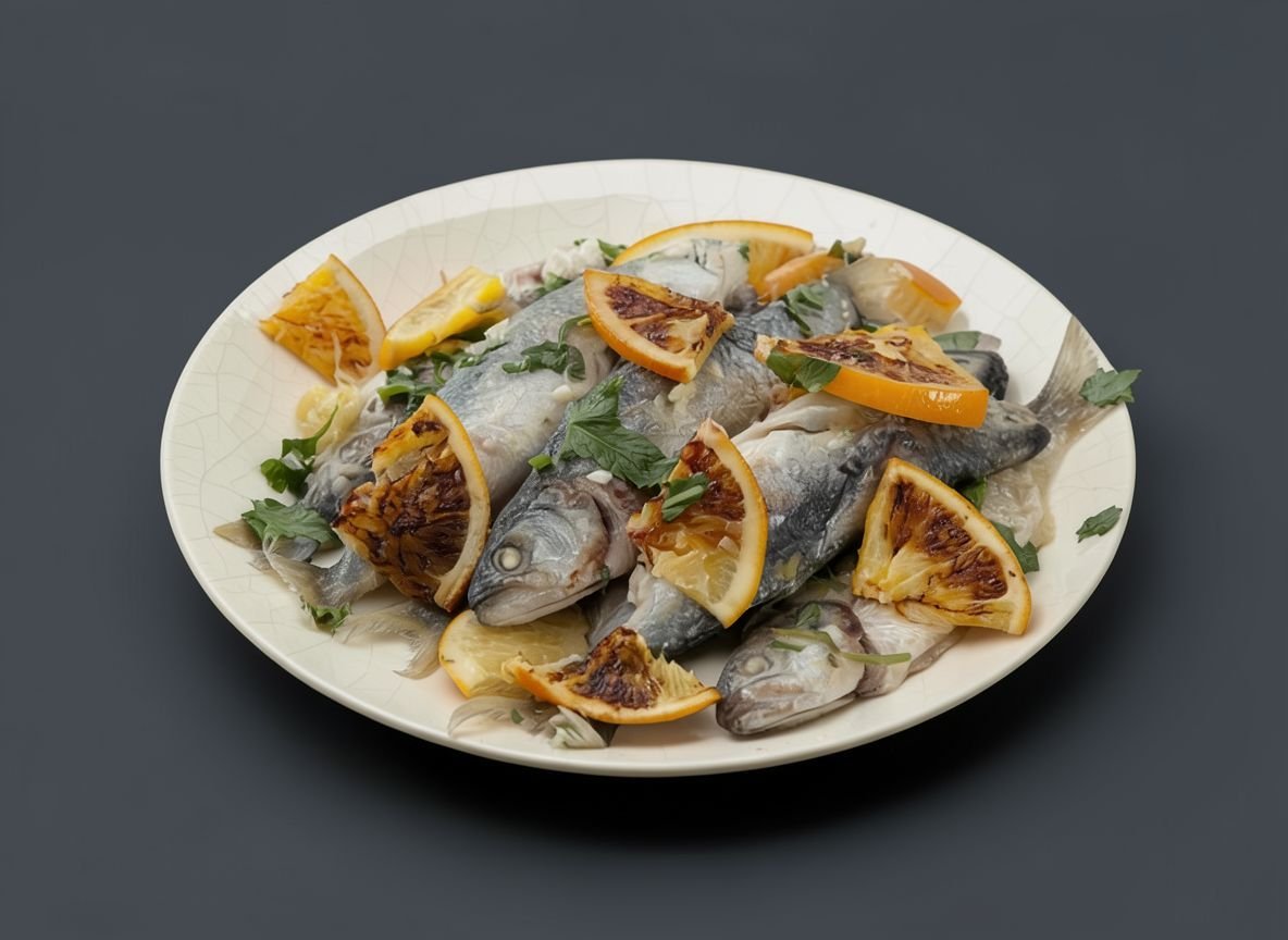 Луфарь жареный с апельсинами и чесноком