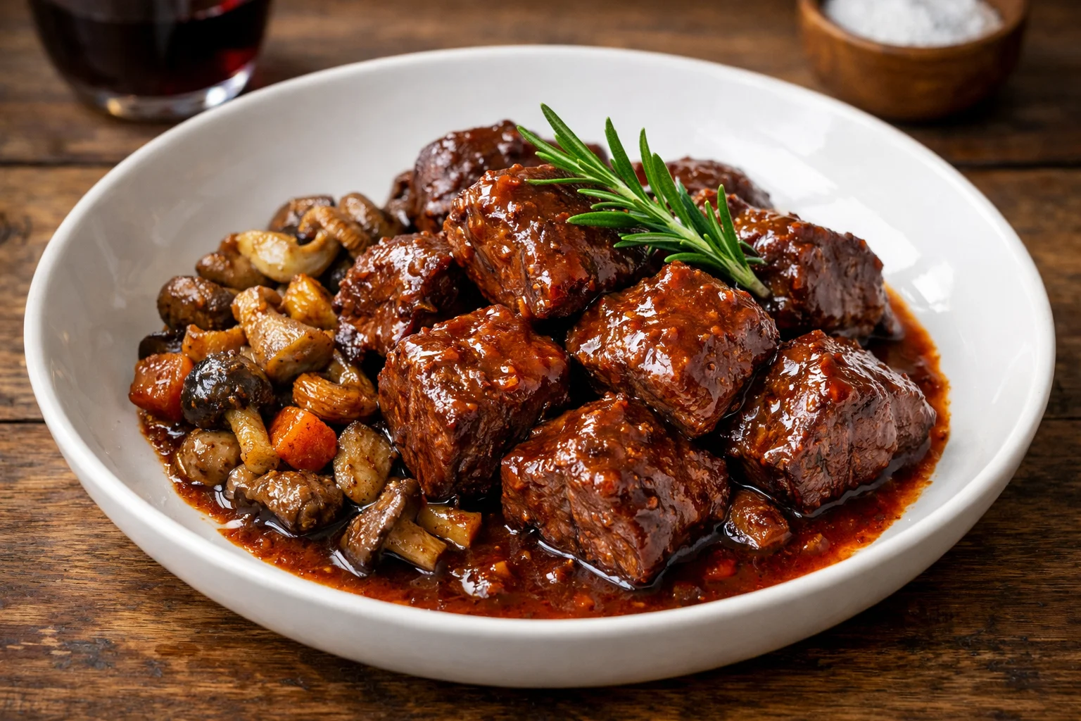Подавать блюдо горячим, выложив куски мяса на тарелку и щедро полив густым соусом. Украсить свежей веточкой розмарина или тимьяна. Лучше всего сочетается с картофельным пюре, полентой, тушёной красной капустой или запечёнными корнеплодами. Идеально раскрывается с бокалом сухого красного вина.