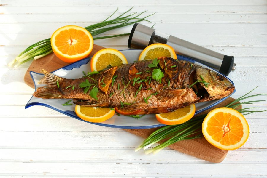 Сазан — крупная (в среднем около 3 кг), пресноводная, промысловая рыба, отличающаяся нежным, сочным, очень вкусным, чуть сладковатым мясом. Кулинары высоко ценят ее гастрономические качества за восхитительные вкусовые характеристики и необыкновенный аромат, позволяющие доминировать в любых блюдах. Кроме того, сазанье мясо еще и полезное, так как в нем много витаминов (А, РР, Е, С, В1, В2) и микроэлементов (фтор, молибден, хром, кобальт, фосфор, фтор и пр.). Благодаря богатому химическому составу, при включении этой рыбы в постоянное меню улучшается работа иммунной системы и укрепляется весь организм в целом. Готовят сазана массой самых разных способов (вялят, жарят, тушат, запекают, фаршируют и пр.). Приготовьте эту рыбу с апельсином, ведь она чудесно сочетается с цитрусом.