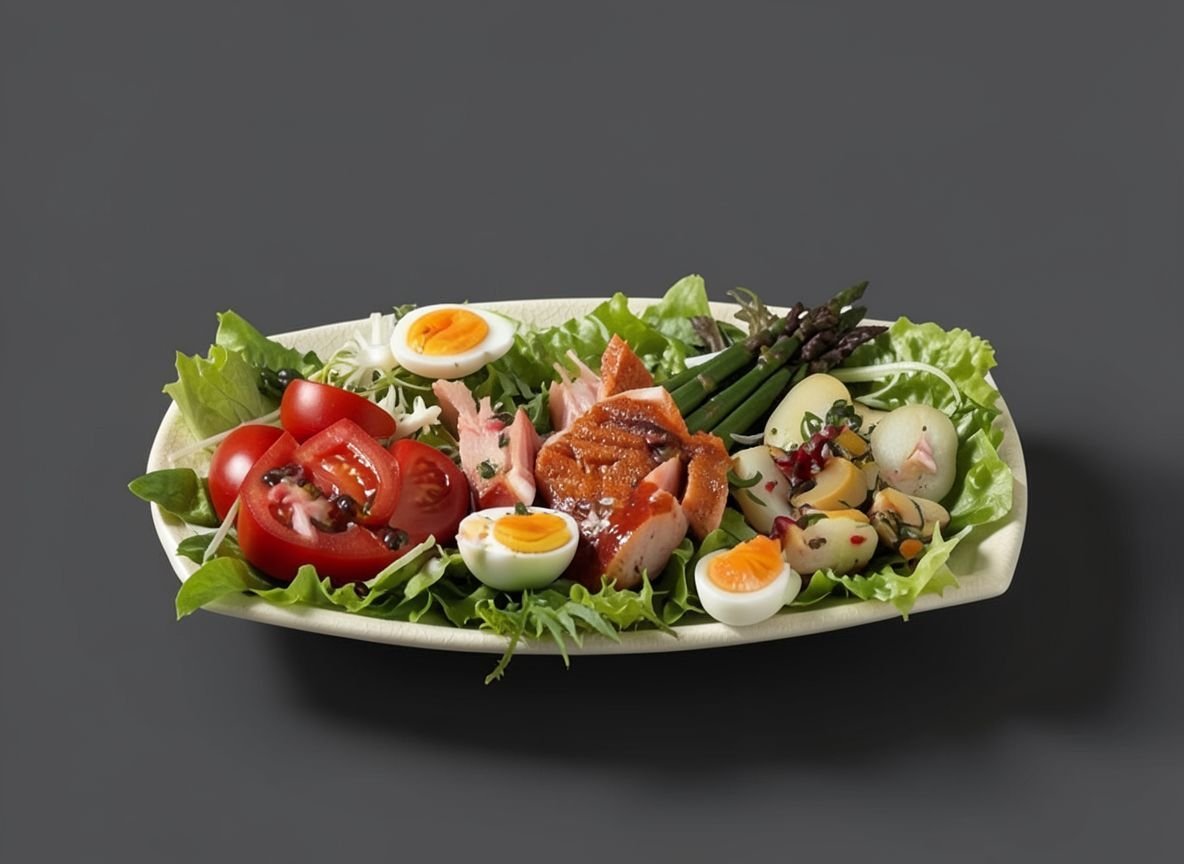 Классический французский салат, по популярности почти не уступающий небезызвестному оливье. Он появился под этим названием еще в конце 19 века. Разновидностей существует масса, состав блюда меняется в зависимости от сезона и является предметом жарких споров среди шеф-поваров. Ингредиенты в этот салат могут входить самые разные, базовое сочетание включает в себя помидоры, анчоусы и оливковое масло. В современные версии добавляется вареный картофель, сладкий перец, зеленая фасоль, лук, артишоки, персики и пр. Выглядит нисуаз очень красиво — все составляющие аккуратно отдельными горками выложены на большой тарелке и политы пикантной заправкой. В нашем варианте этого популярного блюда используются лосось, яйца, томаты и спаржа. Но главное в нисуазе — это заправка, приготовленная на основе оливкового масла с винным уксусом, медом, зеленью и лимонным соком. К рыбе она подходит как нельзя лучше. Отведайте традиционное блюдо из французской кухни, ничего другого вы больше не захотите!