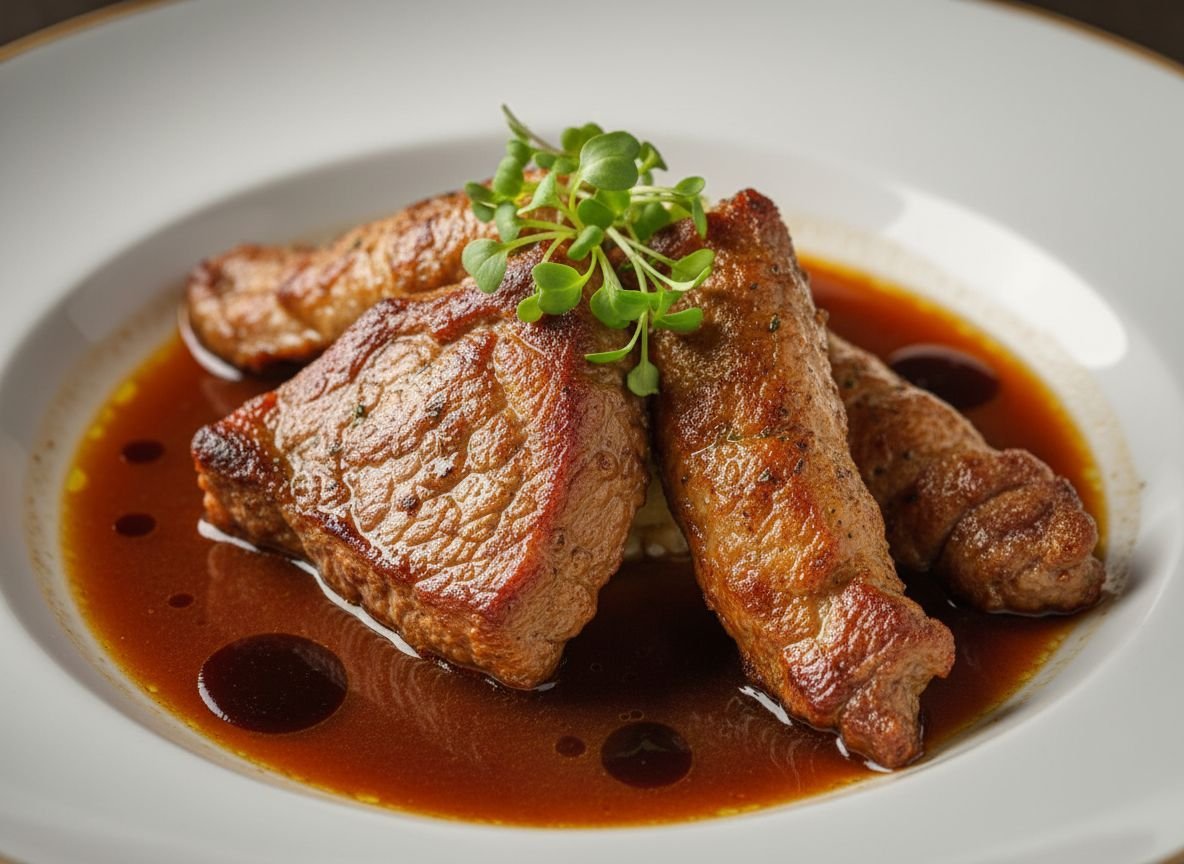 ПодробнееСкат — рыба с плотной, волокнистой текстурой и мягким, деликатным вкусом. Он хорошо держит форму при запекании и при этом остаётся сочным. В этом блюде филе покрывается перечным соусом и быстро запекается при высокой температуре, образуя лёгкую глянцевую глазурь. Контраст создаёт гарнир: свежий шпинат, слегка обжаренный на сливочном масле, упругие маринованные грибы муэр и ореховая нота арахиса. Азиатский соус добавляет кисло-сладкий баланс и глубину, а кунжут завершает вкус лёгким жареным ароматом. В итоге получается выразительное, современное блюдо с понятной структурой и яркой подачей.