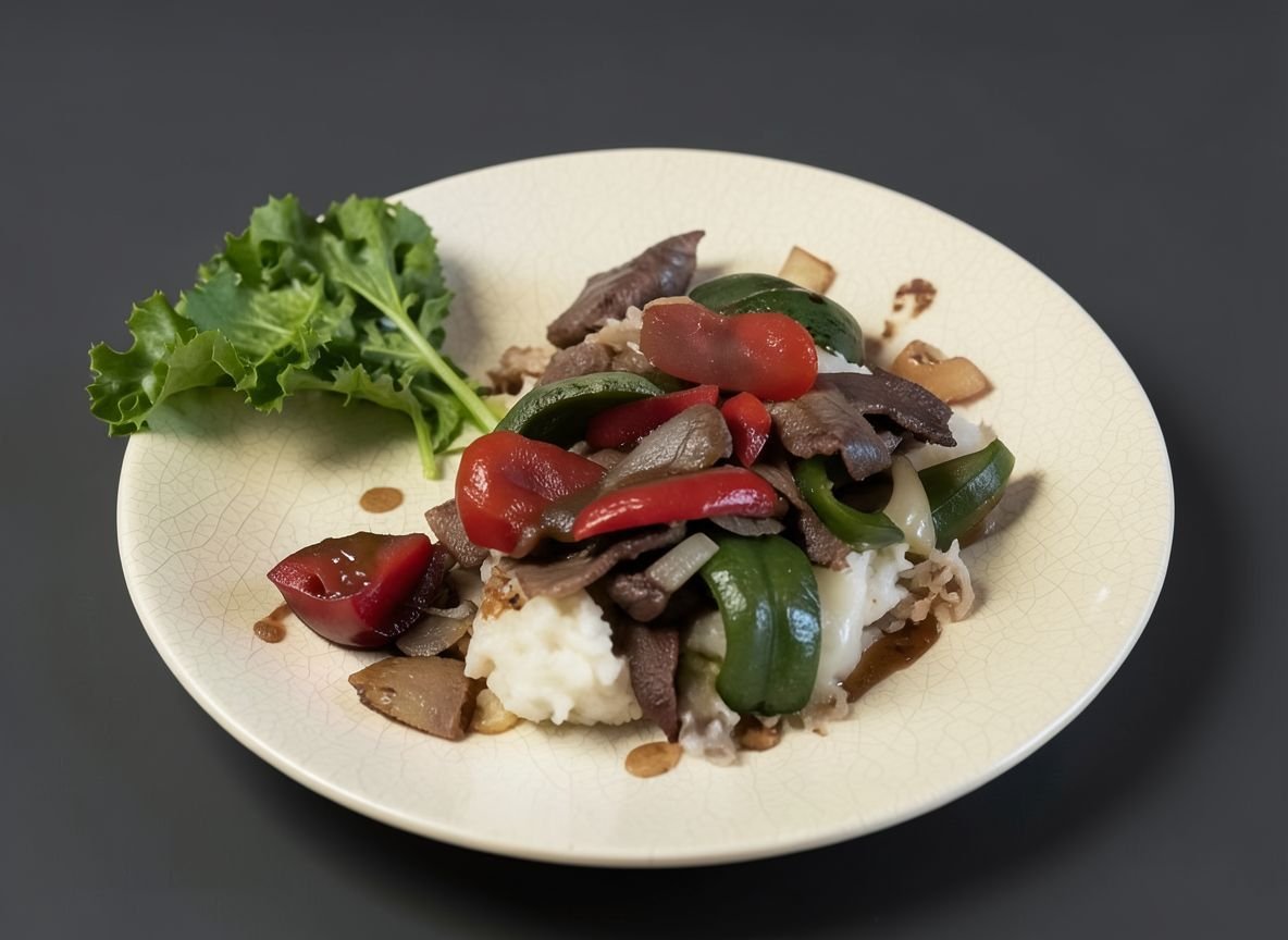 Переложите мясо из сковороды в отдельную посуду и закройте крышкой, чтобы не остыло. В оставшемся от мяса соке обжарьте перец и лук, постоянно помешивая, в течение 5-7 минут. В самом начале добавьте розмарин, а в конце посолите и поперчите.