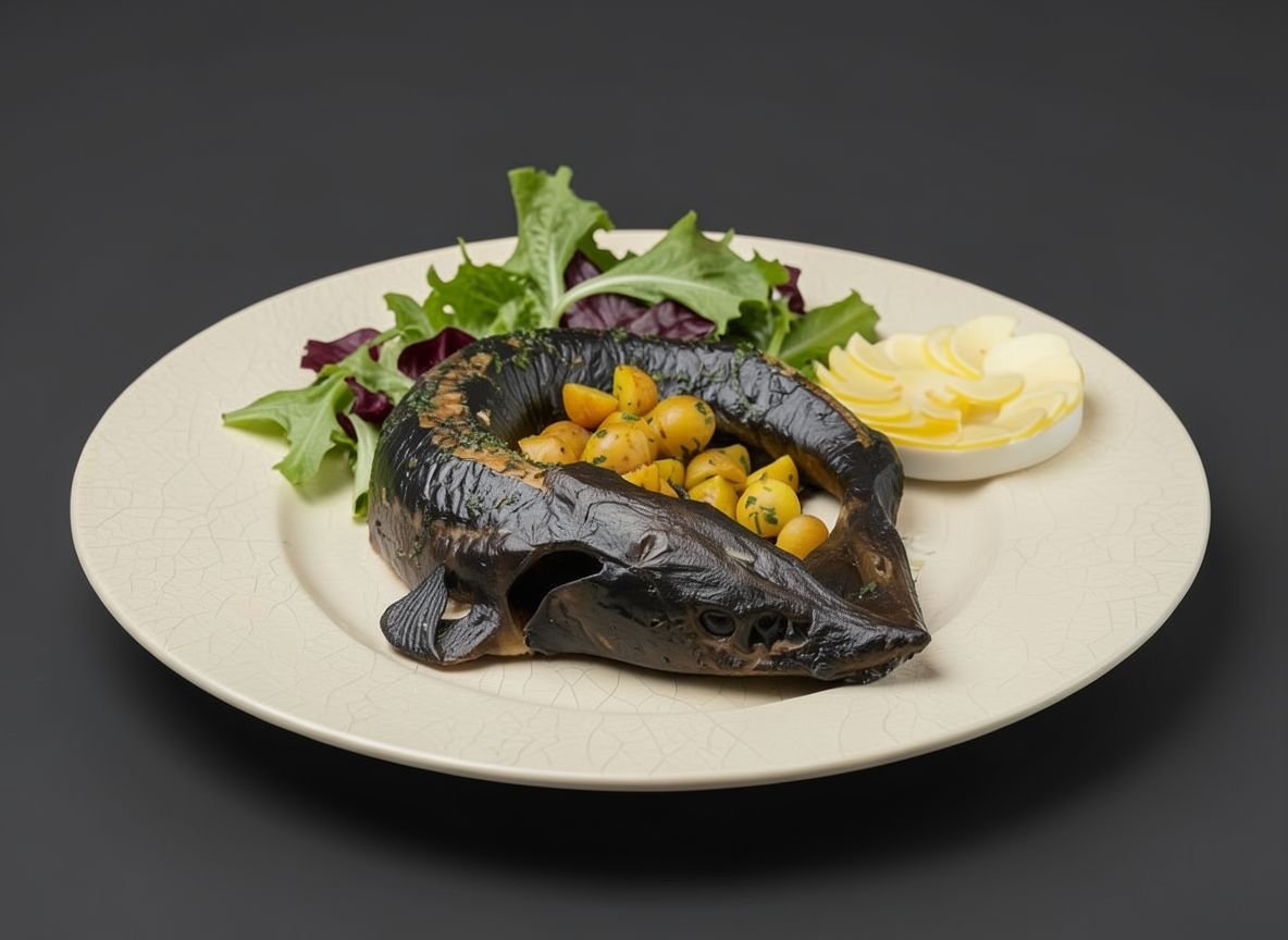 Немного остудите рыбу, переложите на большое блюдо, свернув кольцом. Дополните картофелем и украсьте слайсами второго лимона. Подавайте как самостоятельное блюдо с предпочитаемыми соусами под белое вино. Наслаждайтесь!
