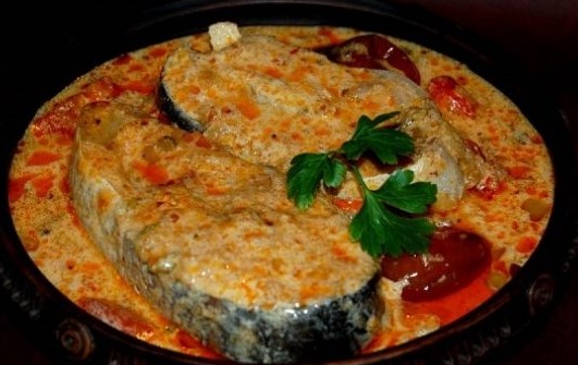 Классический венгерский паприкаш — мясные постные (курятина, телятина) кусочки, тушеные в сметане с луком, сладким перцем и другими овощами. Мы предлагаем немного поэкспериментировать и приготовить это блюдо из сома. Такой паприкаш ничуть не хуже, чем мясной, ведь рыбные стейки получаются невероятно мягкими и нежными, буквально тающими во рту. Хотя для этого рецепта подойдет и любая другая, нежирная рыба. Сом же отличается богатым витаминно-минеральным составом, большим содержанием незаменимых аминокислот и легкоусвояемого белка. Отличительная особенность сома — наличие в составе таких редких микроэлементов, как кобальт, селен и хром. Включение этой рыбы в рацион на регулярной основе предупреждает образование атеросклеротических бляшек в сосудах, уменьшает риск развития ишемической болезни и инсультов, а также защищает от тромбозов и благотворно влияет на кровообращение.