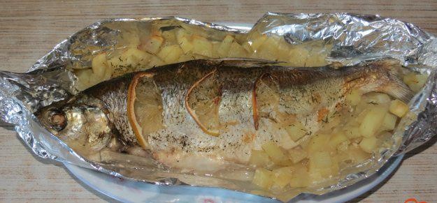 Отрезать кусок фольги, свернуть из него некое подобие лодочки. Туда определить рыбину, по бокам от нее насыпать картофельной смеси. Сверху положить дольки лимона.
