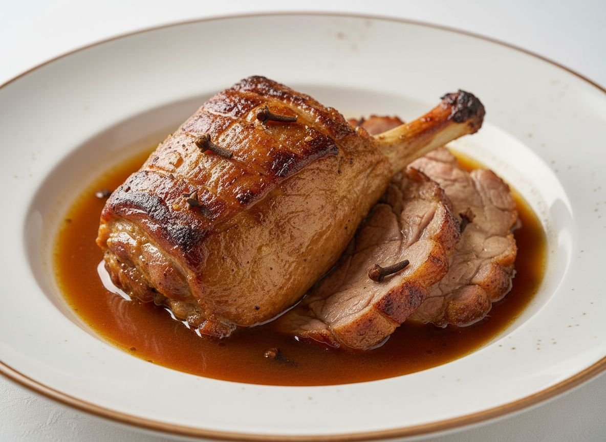 Достаньте окорок, дайте отдохнуть под фольгой около получаса, затем нарезайте и подавайте.