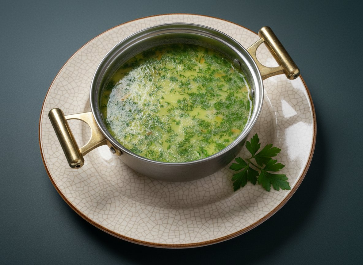 Добавить в бульон сметану, попутно помешивая, а также огурцы, зелень петрушки. Довести до кипения и подавать к столу.