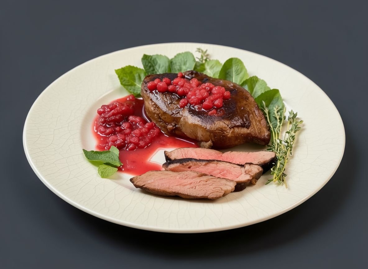 ПодробнееЛопатка косули — благородная часть дикой косули с нежным мясом и богатым вкусом, который особенно хорошо раскрывается в сочетании с кисло-сладкими акцентами. В этом рецепте косуля маринуется в красном вине с ягодами и травами, запекается до сочной степени прожарки medium, а затем подаётся с глазированной грушей и ароматным клюквенным соусом. Сочетание сладости груши и яркой кислинки клюквы делает это блюдо идеальным для праздничного обеда или эффектной ресторанной подачи.