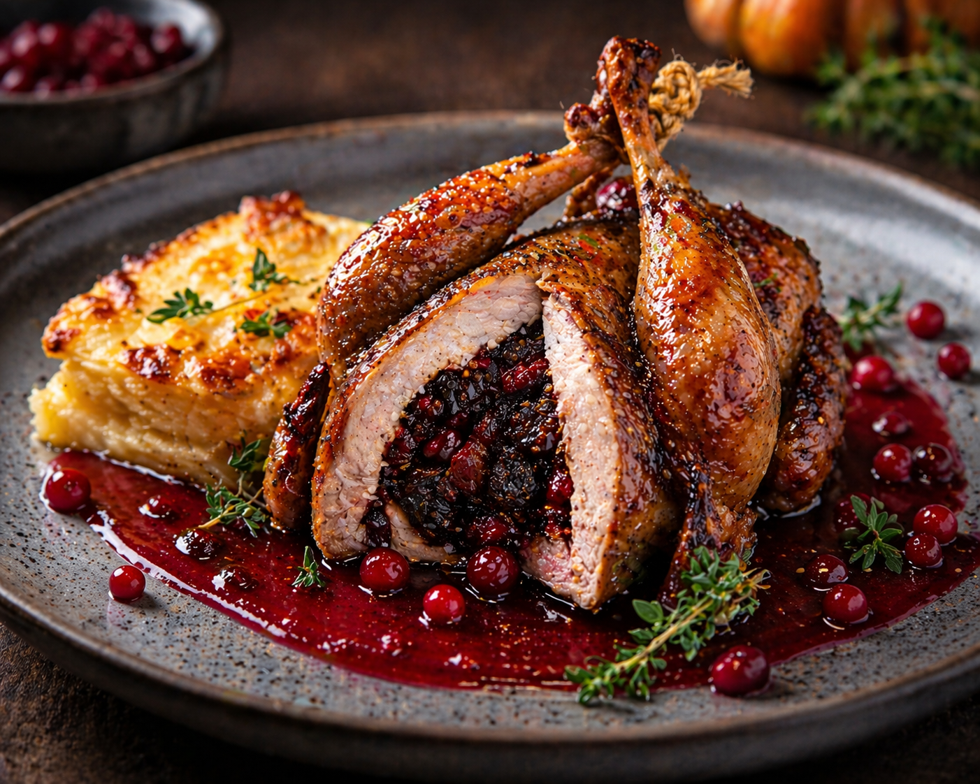 Рябчик фаршированный копчёным черносливом с брусничным соусом