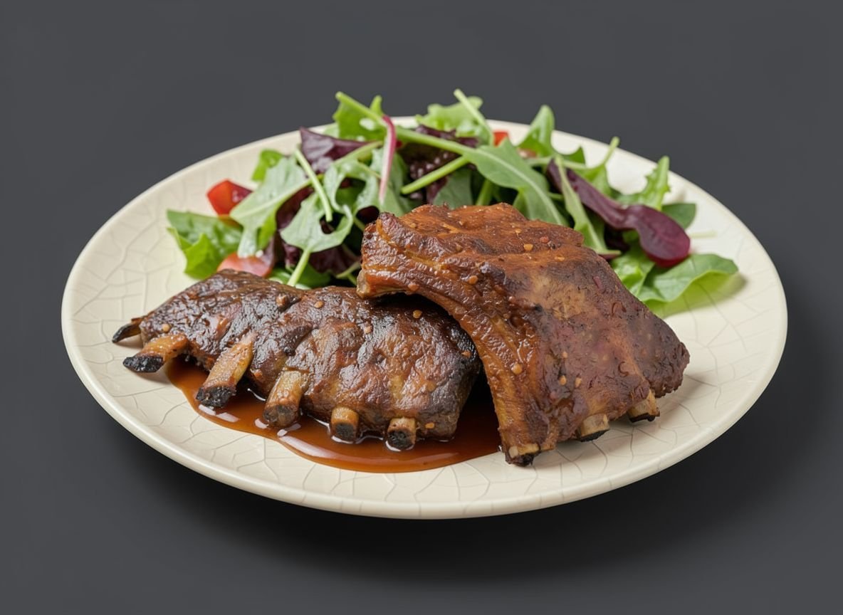 Выньте готовые рёбрышки из печи, дайте отдохнуть 10 минут. Затем разрежьте вдоль костей и сервируйте с картофелем или просто со свежим хлебом. При подаче полейте мясо оставшимся соусом и украсьте запечёнными овощами.