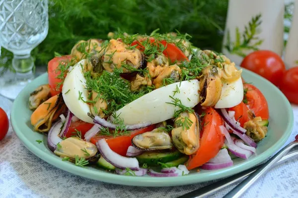 Легкий салат с мидиями Грея готов, подавать к столу его нужно сразу же. В качестве дополнения идеально подойдет кусочек поджаренного и подсушенного белого хлеба (батона).