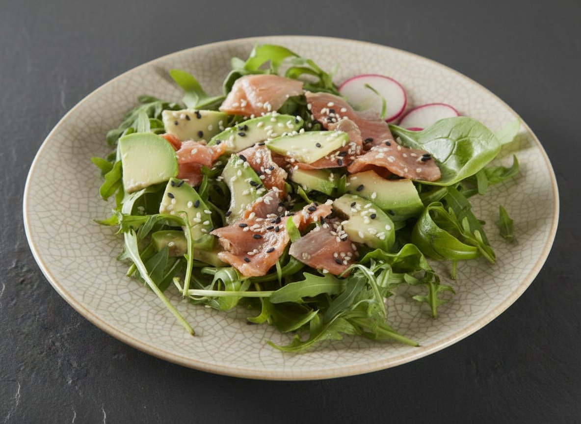 Выложите на блюдо рукколу, добавьте лук и черри, сверху выложите рыбу, заправьте ложкой соуса из сковородки. Перед подачей этот салат не перемешивают. Обратите внимание, что солить блюдо не надо, так как соус уже соленый и пряный.