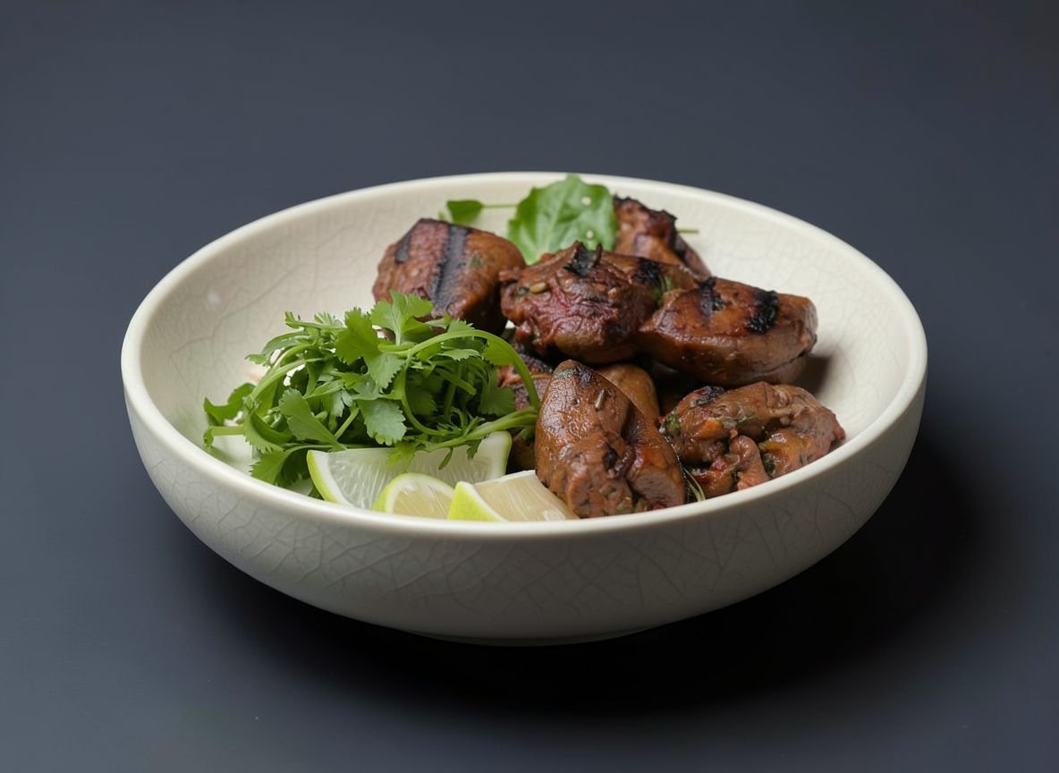 Отделите мясо, нарежьте кусочками, со стороной 2-2,5 сантиметра. Печень разделите пополам. Поместите все мясо в миску и приступайте к приготовлению маринада.