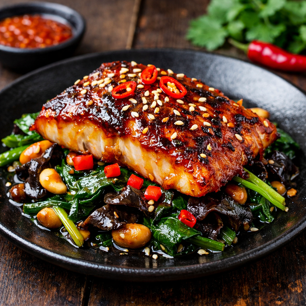 Скат — рыба с плотной, волокнистой текстурой и мягким, деликатным вкусом. Он хорошо держит форму при запекании и при этом остаётся сочным. В этом блюде филе покрывается перечным соусом и быстро запекается при высокой температуре, образуя лёгкую глянцевую глазурь. Контраст создаёт гарнир: свежий шпинат, слегка обжаренный на сливочном масле, упругие маринованные грибы муэр и ореховая нота арахиса. Азиатский соус добавляет кисло-сладкий баланс и глубину, а кунжут завершает вкус лёгким жареным ароматом. В итоге получается выразительное, современное блюдо с понятной структурой и яркой подачей.