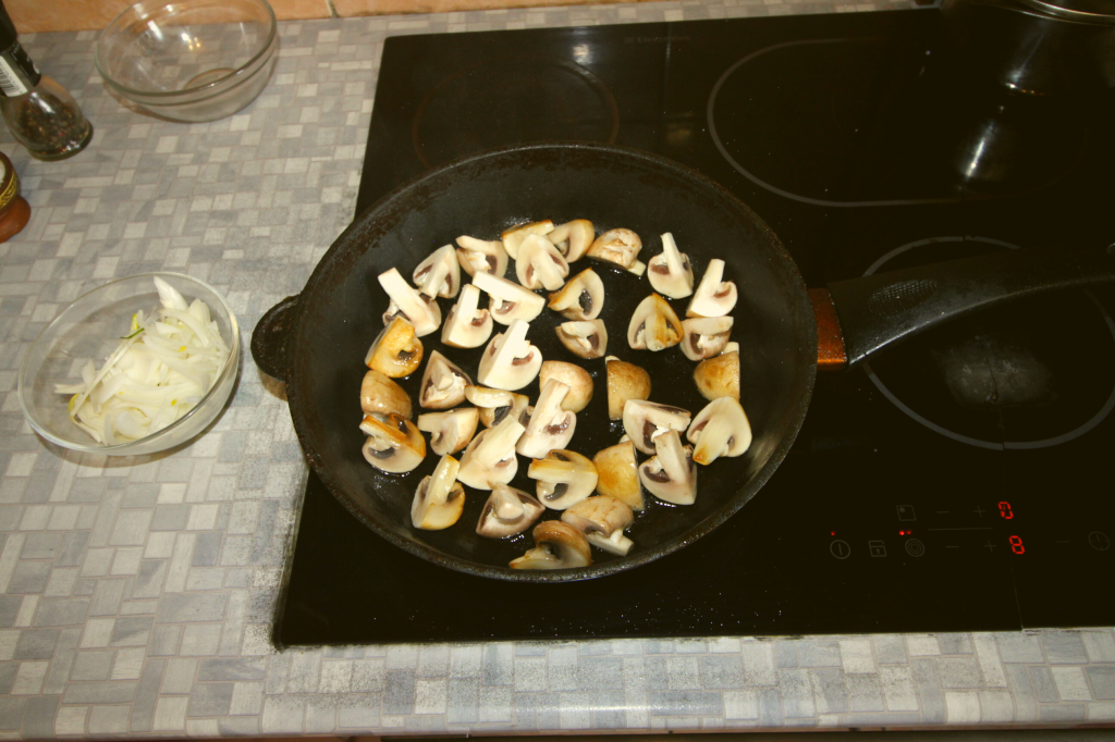 Займитесь гарниром. Нашинкуйте грибы четвертинками, лук соломкой. На высокой температуре разогрейте сковородку. Влейте столько масла, чтобы дно оказалось покрыто. Обжарьте грибы в течение 7-8 минут, перемешивая. Потом заложите лук. Посолите и поперчите по вкусу. По желанию добавьте немного кориандра. Готовьте все вместе ещё 1,5-2 минуты и уберите с плиты.