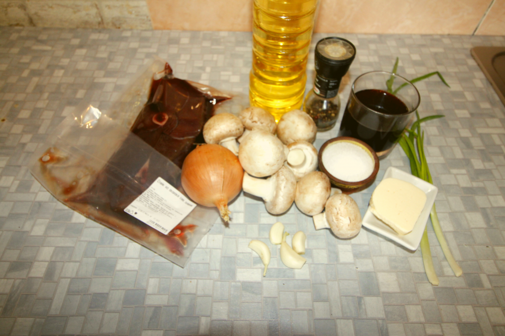 Подготовьте все продукты — мясо, лук с чесноком, масло, грибы, специи и зелёный лук.