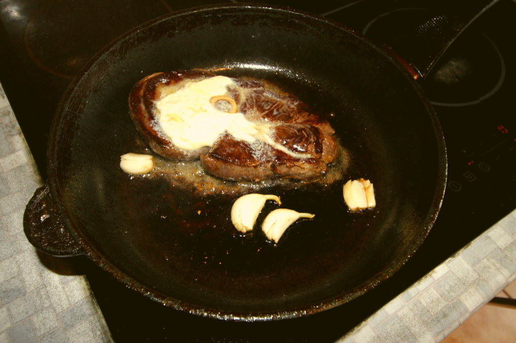 Теперь переходите к мясу. Поставьте чистую сковородку нагреваться на максимальной температуре. Влейте немного масла. Обжарьте стейк по 1,5 минуты на каждой стороне. Уменьшите огонь, повторите шаги. На последнем этапе добавьте в сковороду раздавленные зубчики чеснока, распределите по стейку сливочное масло, влейте вино, приправьте соус солью и перцем по вкусу.