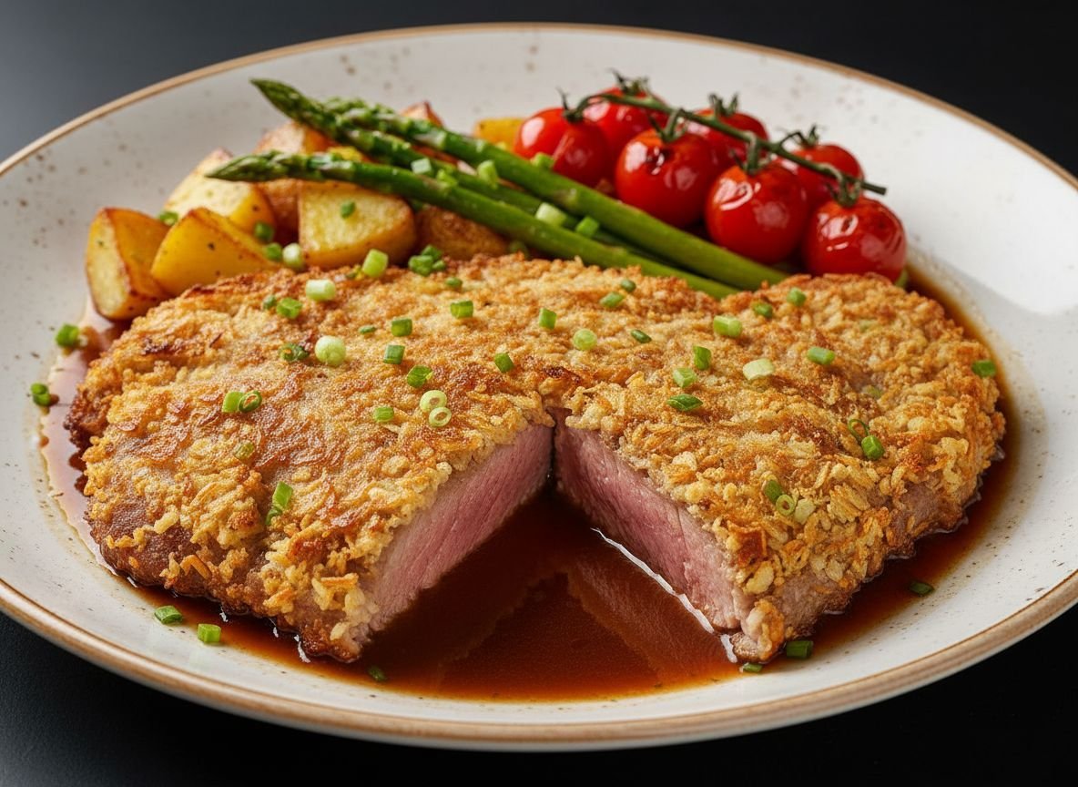 Одновременно с приготовлением картофеля, в отдельной кастрюльке отварите спаржу. Подавайте стейки с картофелем и спаржей, украсив измельчённой зеленью — розмарином и луком.