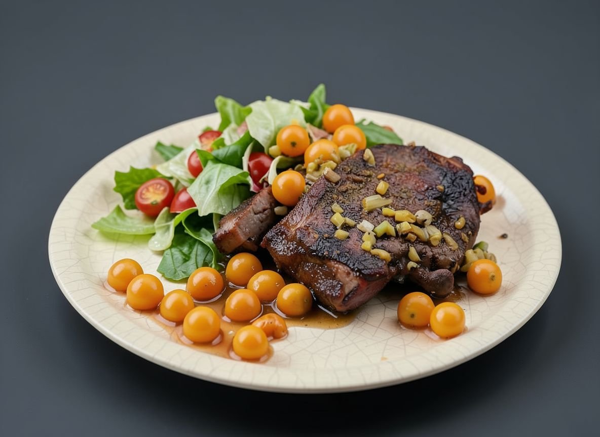 Подавайте стейк, политый только что приготовленным соусом и ягодами. Добавьте к блюду свежий хрустящий хлеб, а также, при желании, гарнир из картофеля или бобовых. Приятного аппетита!