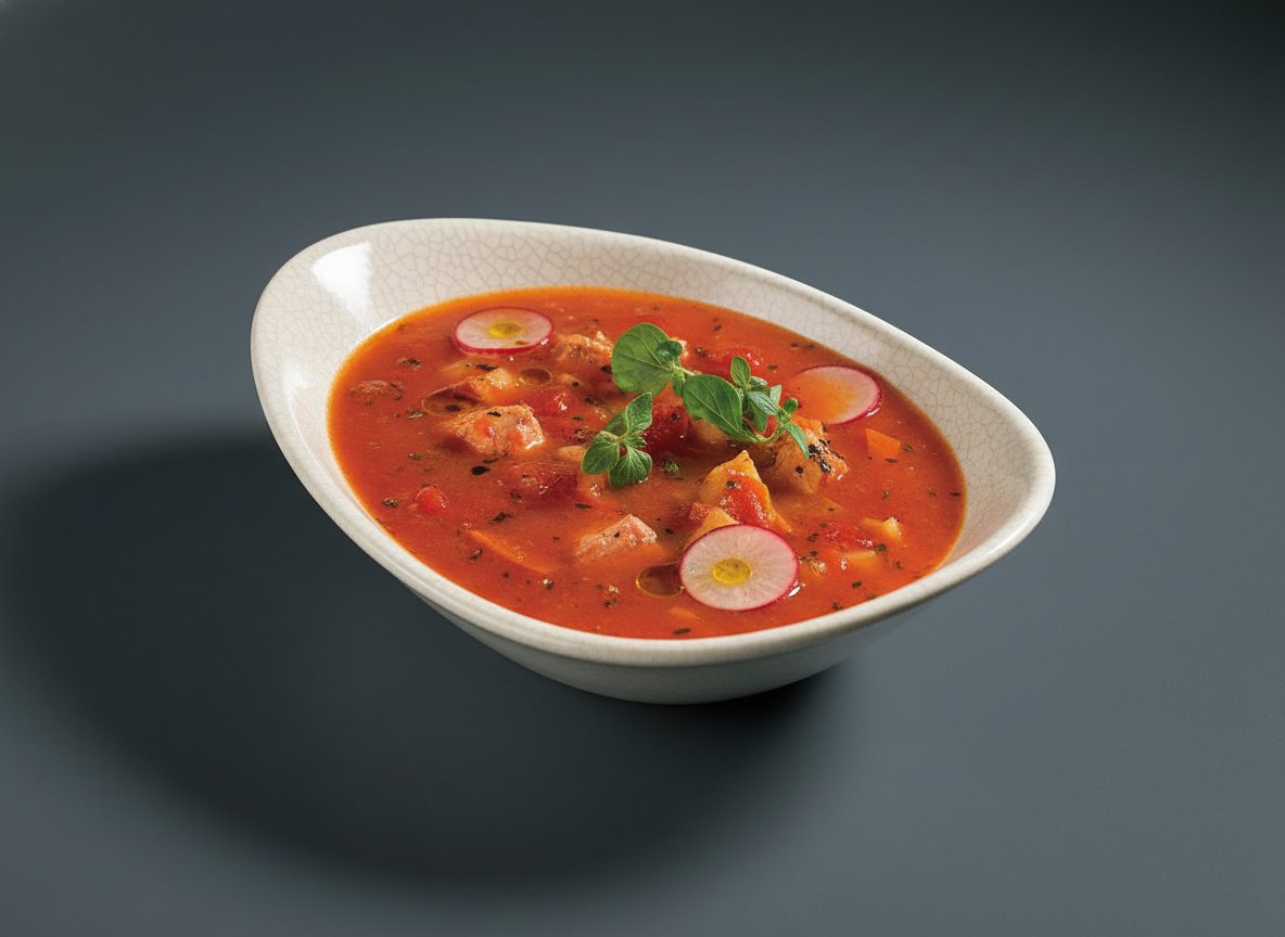 Великолепный острый суп из благородной форели в необычном сочетании с томатами. Готовится настолько быстро, что его можно делать на завтрак. Выглядит очень красиво, особенно украшенный свежим соцветием душистого базилика или петрушки. Важно! Для приготовления необходимо выбирать томатную пасту Mutti или Barilla. По крайней мере вы должны быть уверены, что в пасту не добавлен уксус, так как в бульоне с уксусом овощи варятся очень долго и даже спустя час все еще будут оставаться твердыми. Для литра рыбного бульона нужно взять 20 грамм сублимированного порошка.