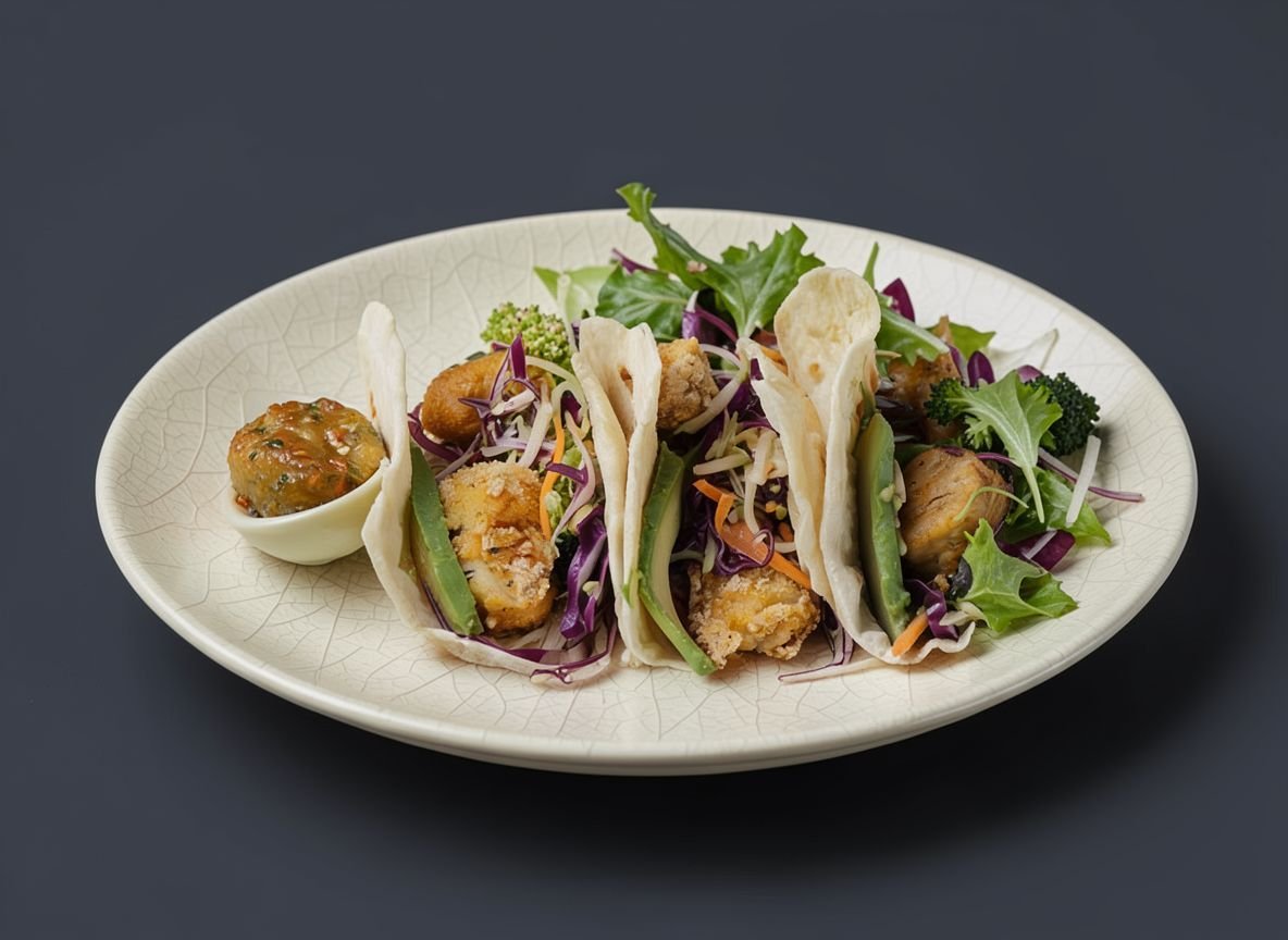 Теперь осталось порезать слайсами авокадо и собрать тако. Смажьте центр каждой тортильи соусом, положите рыбу, овощной салат и авокадо. Придайте лепёшкам форму полуоткрытого сэндвича.