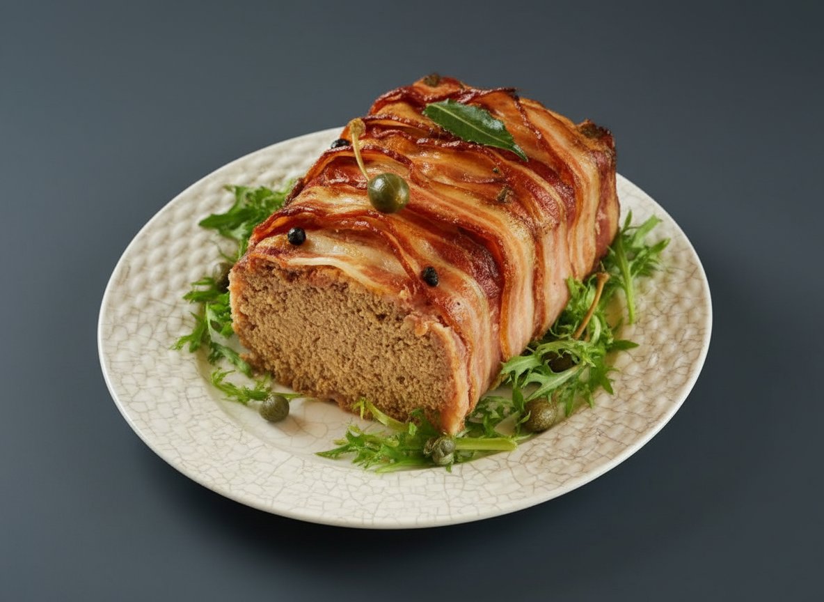 Смешайте все ингредиенты, поместите в емкость для запекания, разровняйте ложкой верхний слой и выложите полоски бекона так, чтобы они закрывали всю поверхность. При этом бекон можно немного растягивать.