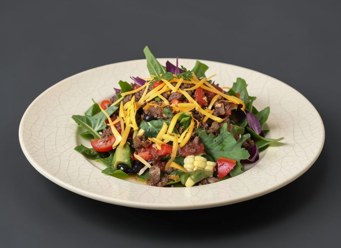 Осталось собрать салат. В зависимости от количества порций разделите ингредиенты на 4 или 6 частей. Выложите на каждую тарелку зелень, потом остальные свежие и консервированные овощи. Завершите салат порцией обжаренного мяса, украсьте тёртым сыром и чипсами.