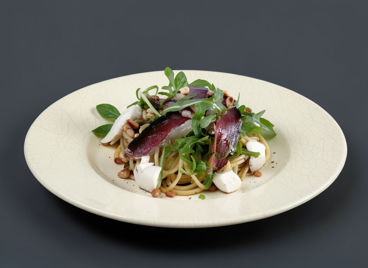 Осталось соединить заготовки на тарелках. Разделите спагетти на порции, украсьте Моцареллой, поместите сверху ломтики утиной грудки, посыпьте орешками и добавьте несколько листиков рукколы.
