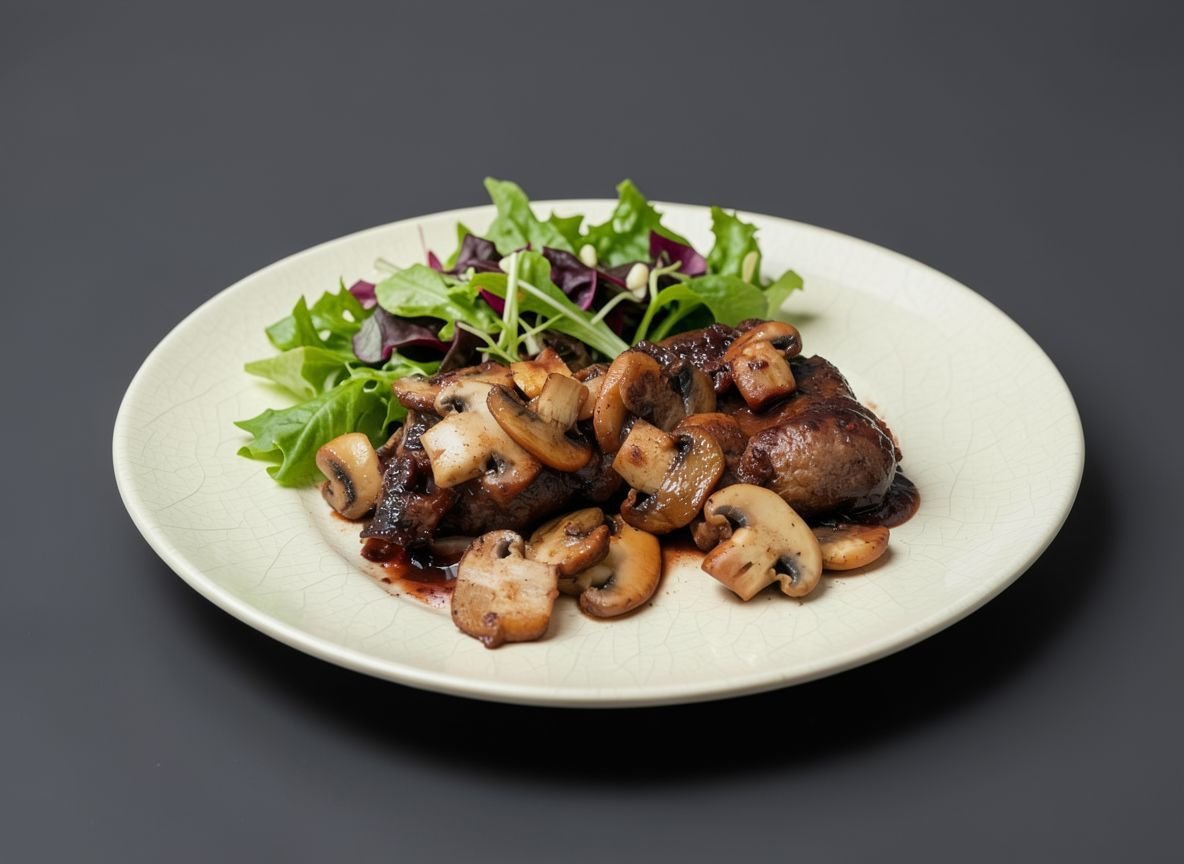 В сервировочное блюдо выложите вырезку, посыпьте грибами и обильно полейте соусом. Наслаждайтесь с любимыми гарнирами: с салатом или жареными овощами, картофелем с чесноком или рисом, приготовленным на пару. Приятного аппетита!