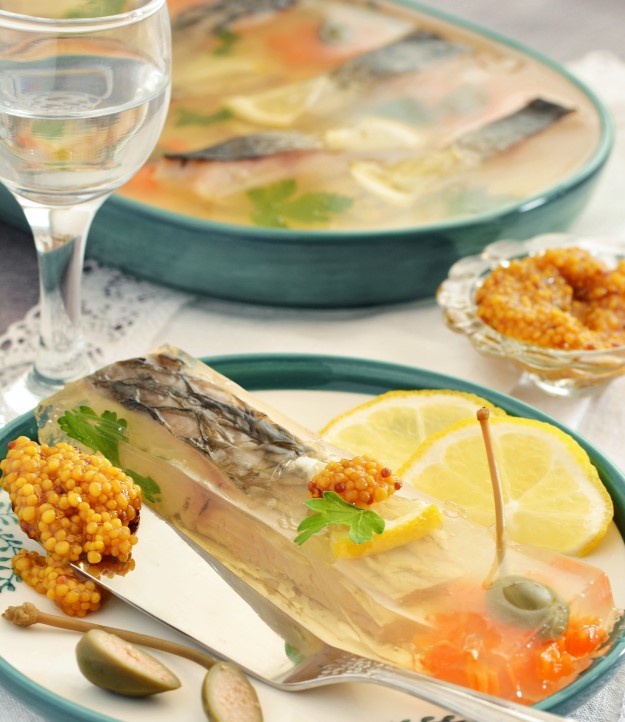 На дно посудины налить немного бульона (высота около 5 мм). Поместить в холодильник и дать ему застыть. Когда этот слой застынет, разложить по нему рыбные кусочки и полить их бульоном.